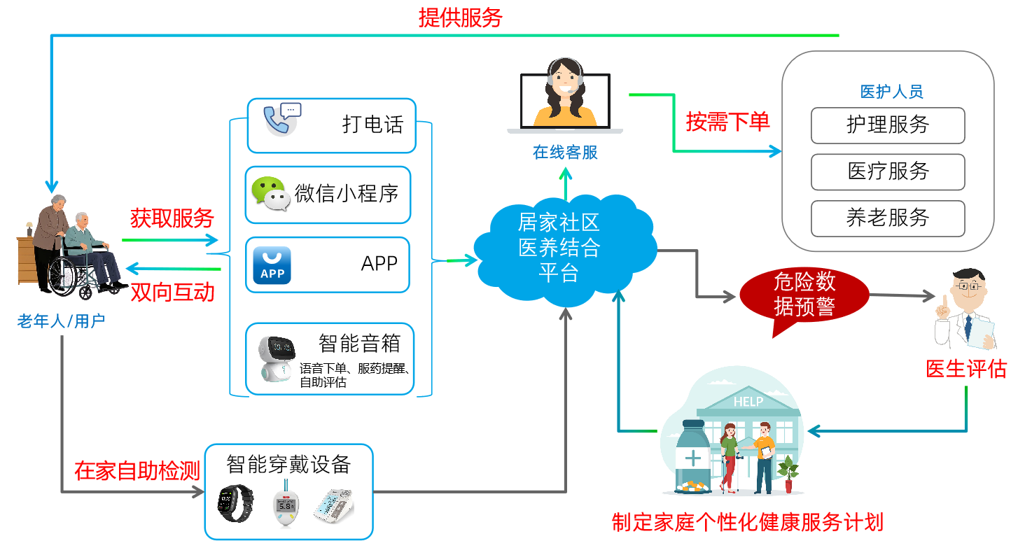 智慧养老服务平台是在深刻理解国家政策和养老服务体系特点的基础上,运用各种先进的信息技术(物联网、互联网、移动互联网技术、智能呼叫、云技术、GPS定位技术等),创建 “系统+服务+老人+终端”的智慧养老服务模式,并且涵盖了机构养老、居家养老、社区日间照料等多种养老形式。通过跨终端的数据互联及同步,连通各部门及角色,形成一个完整的智慧管理闭环,实现老人与子女、服务机构、医护人员的信息交互,对老人的身体状态,安全情况和日常活动进行有效监控,及时满足老人在生活、健康、安全、娱乐等各方面的需求。